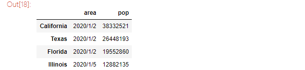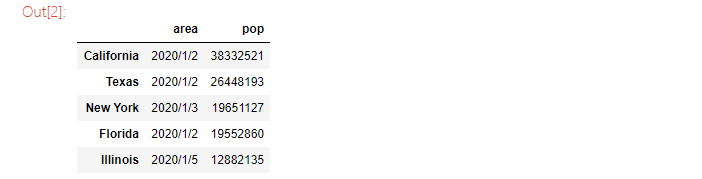 area = pd.Series({'California':'2020/1/2', 'Texas': '2020/1/2', 'New York': '2020/1/3', 'Florida': '2020/1/2', 'Illinois': '2020/1/5'})