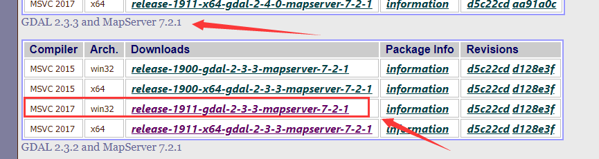 2、 查看完编译器和位数后,从网站下载GDAL,我选择的是GDAL-2.3.3.win32-py2.7.msi与gdal-203-1911-core.msi这两个文件进行下载,下载步骤如图三和图四。