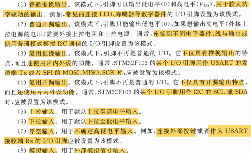 每个I/O引脚有8种工作模式,在复位时和刚复位后,复用功能未开启,I/O引脚被配置成浮空输入模式;