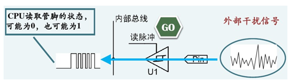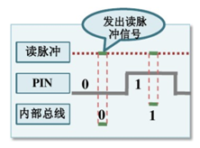 其中的缓冲器U1是具有控制输入端,且具有高阻抗特性的三态缓冲器;通俗地说就是这个缓冲器对外来说是高阻的, 相当于在控制输入端不使能的情况下,物理引脚与内部总线之间是完全隔离的,完全不会影响内部电路;而控制输入端的作用就是可以发出读Pin状态的操作指令,其过程如下图所示: