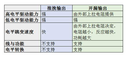 对于开漏输出和推挽输出的区别最普遍的说法就是开漏输出无法真正输出高电平,即高电平时没有驱动能力,需要借助外部上拉电阻完成对外驱动。