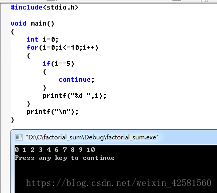 可以看出打印1-10,其中唯独缺少了5,这是因为当i=5时,continue了,但是循环并没有跳出,而是继续执行循环,直到循环条件不再满足。