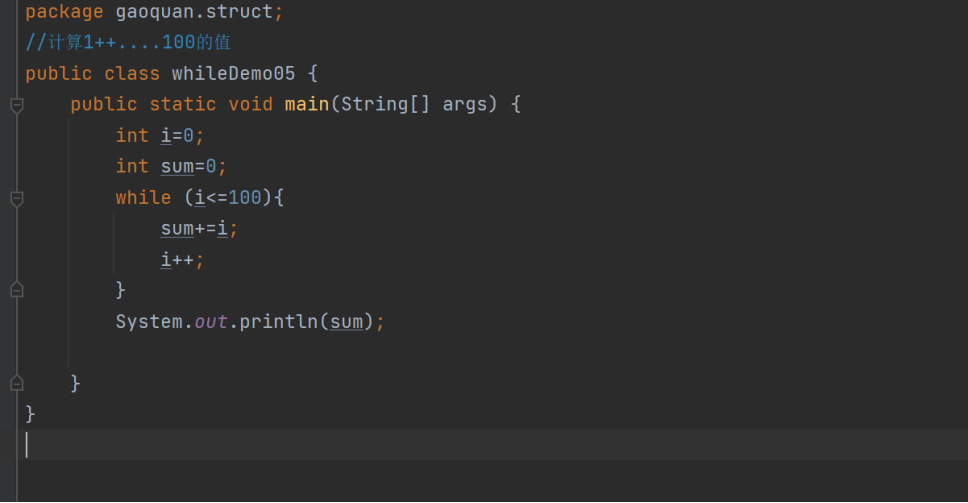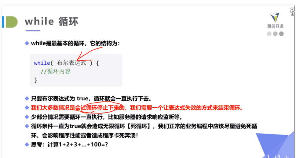 while结构是只要条件为真,就会一直执行下去,在布尔表达式中填写条件