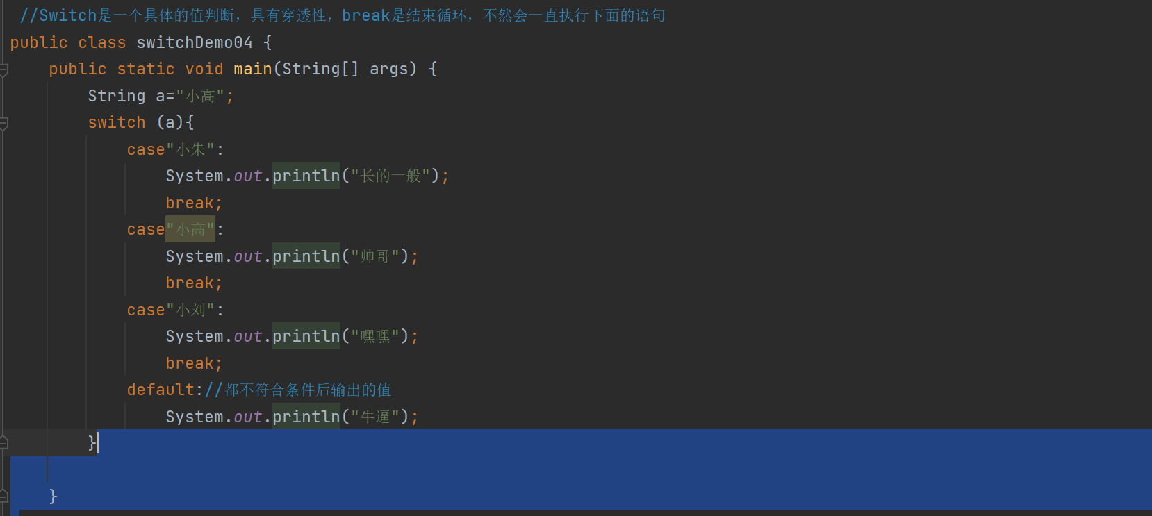 这个结构用于固定值得一个筛选,必须是一个固定的值,不然无法进行筛选,这个结构具有穿透性,你必须写break进行结束,不然他会一直执行到最后一行代码。