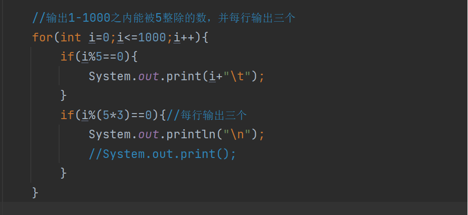在for循环中还可以嵌套if选择结构,如图所示,可以看到i%5==0的意思就是能被5整除的数字,满足则输出,而i%(5*3)==0则表示判断输出的数字,这个要每行输出三个,则还有输入system.out.print()换行代码才能实现。