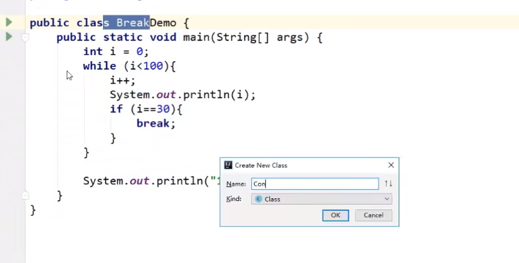 上面一个代码是输出到30之后结束,不在输出值,而下面的代码则会跳过那个符合条件的值,然后输出不符合条件的值。