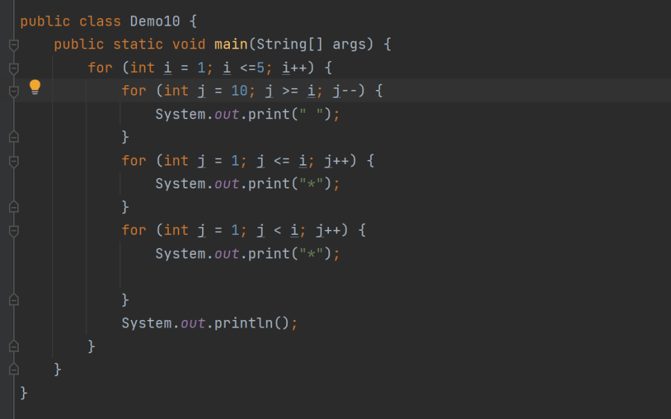 以上就是漂亮溪流最近收集整理的关于JAVA选择结构和循环结构详解1:顺序结构 2:If结构 3:Switch多选择结构 4:while循环结构5.DoWhile循环结构6.for循环7:break和continue的使用8:三角形的打印 的全部内容,更多相关JAVA选择结构和循环结构详解1:顺序结构 2:If结构 3:Switch多选择结构 4:while循环结构5.DoWhile循环结构6.for循环7:break和continue内容请搜索靠谱客的其他文章。