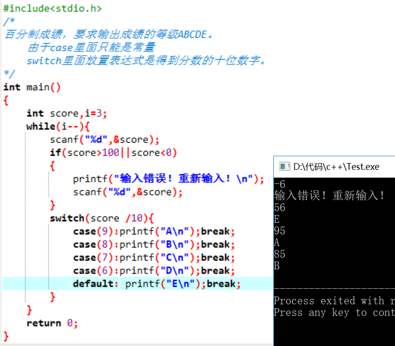 例题:百分制成绩,要求输出成绩的等级ABCDE。