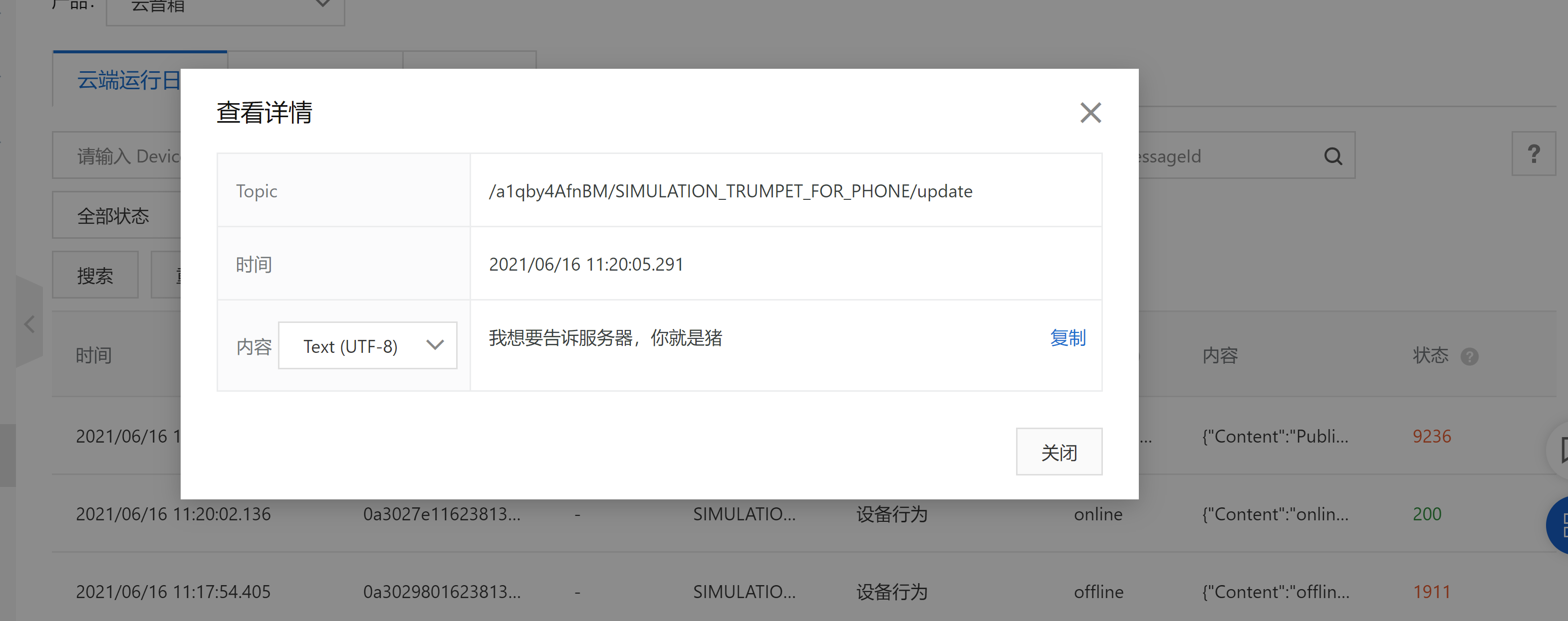 业务服务器收到两条数据,一条设备上线数据、一条设备发送数据。