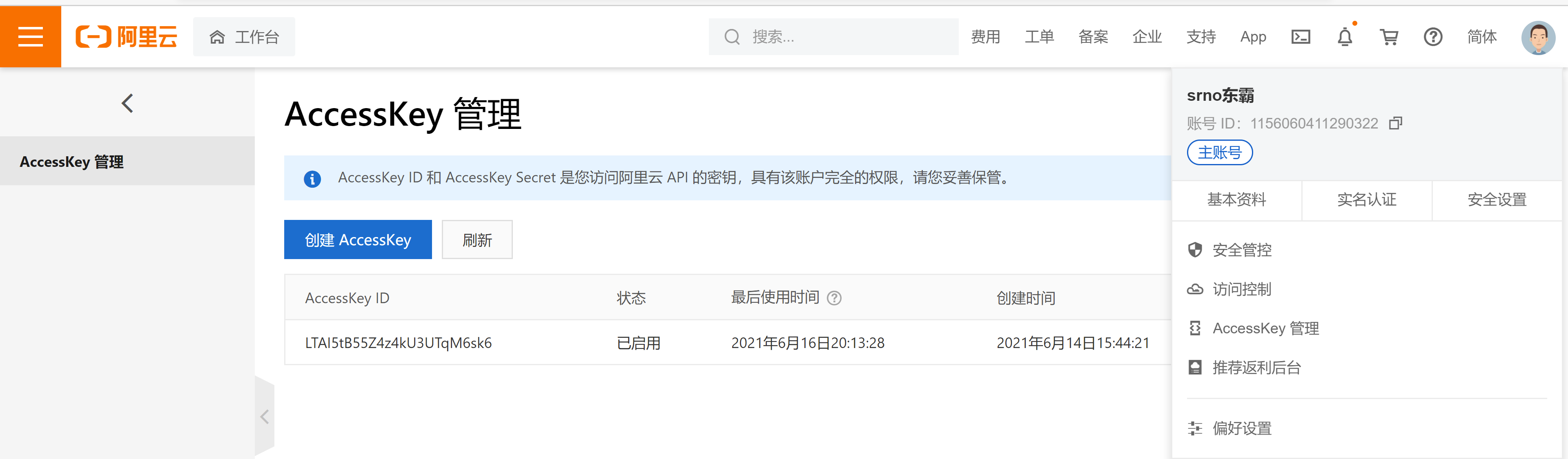 其中host所要填的用户id和accessKey,accessSecret可以在右上角的头像中找到