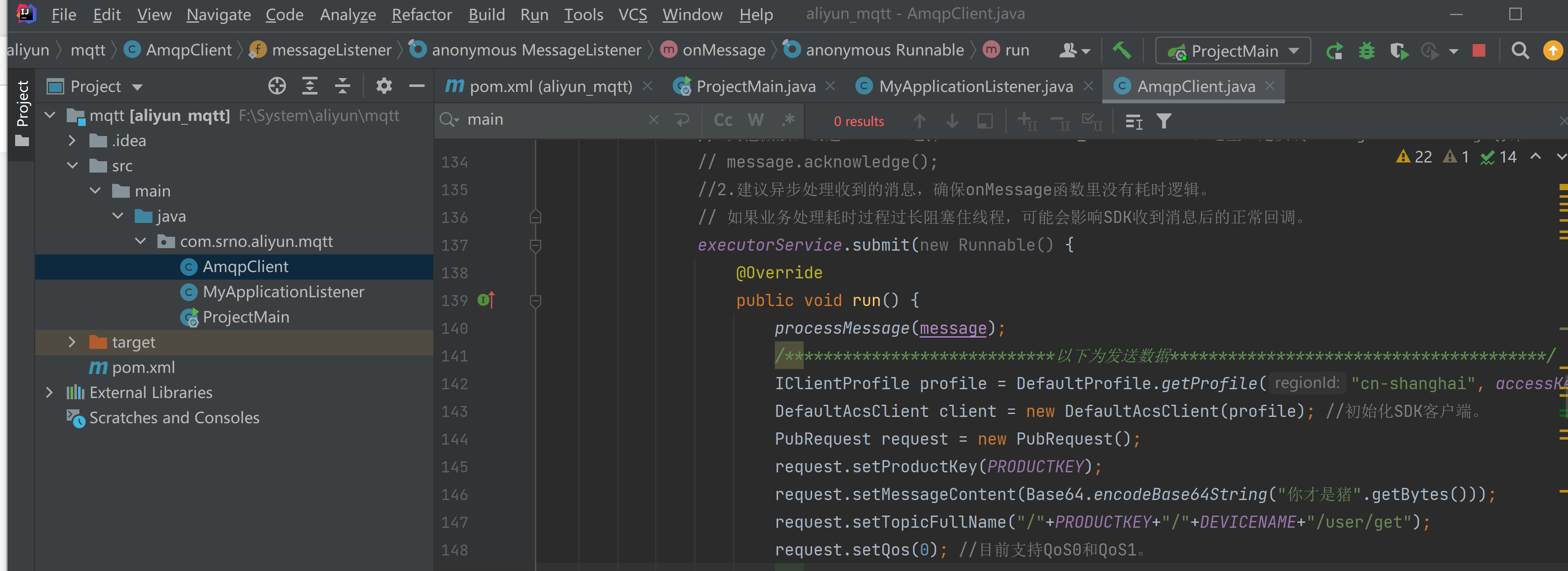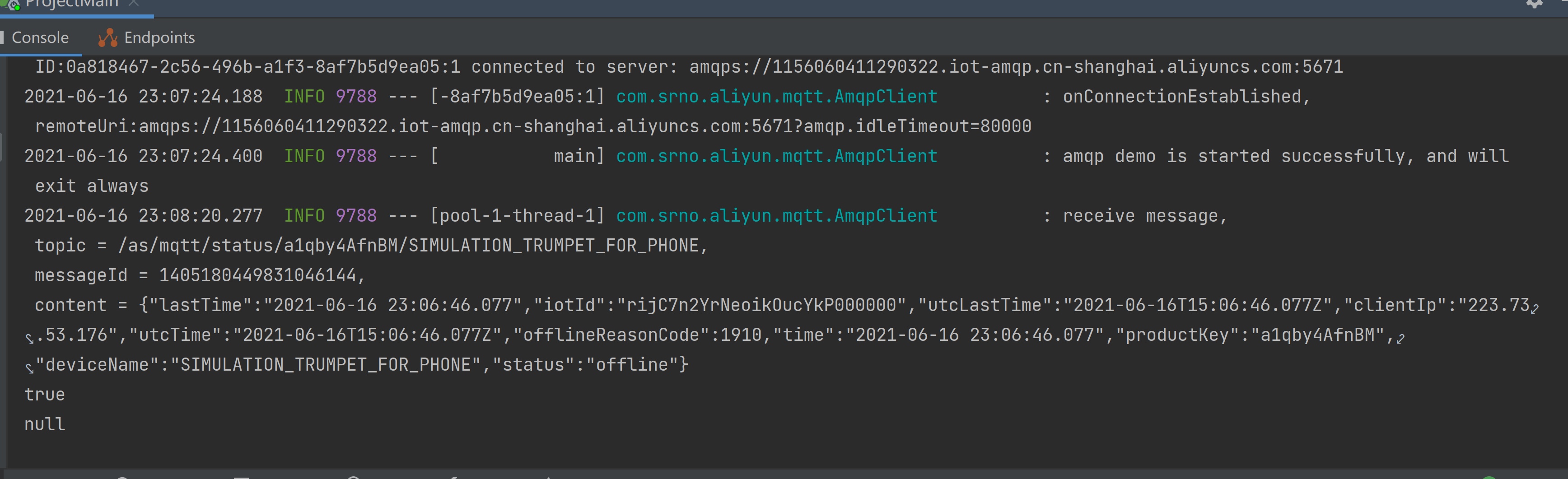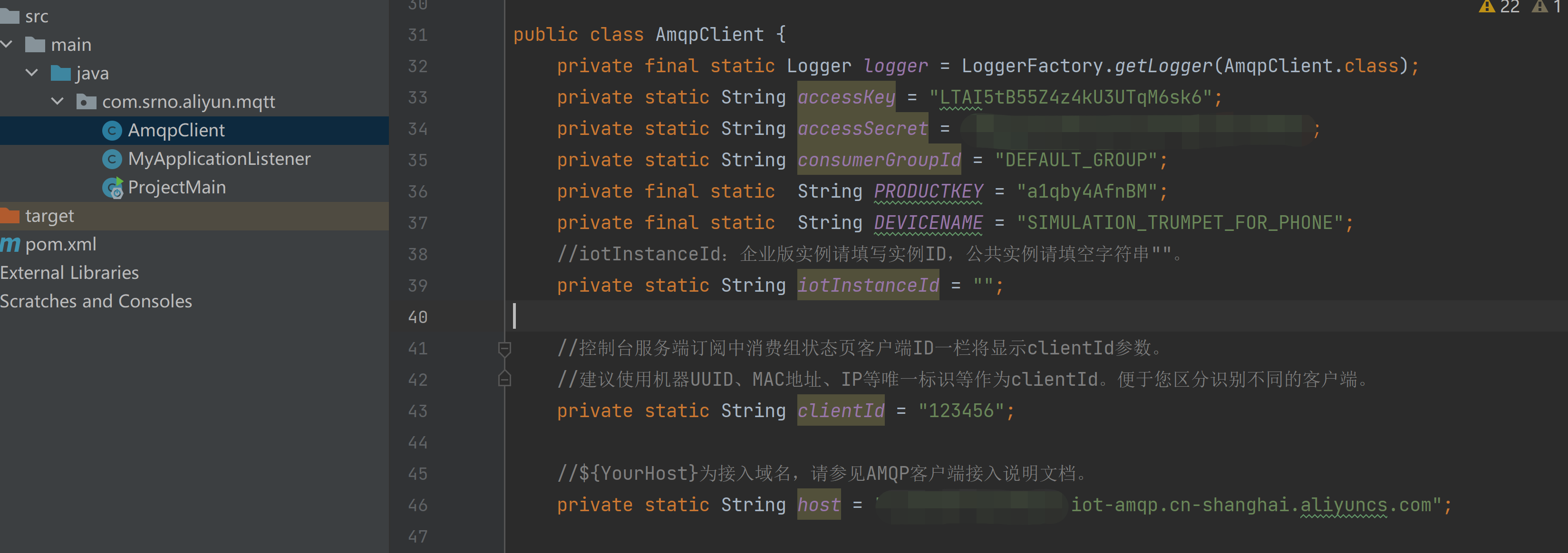之后在idea代码中填入accessKey,accessSecret,consumerGroupId,PRODUCTKEY,DEVICENAME,host