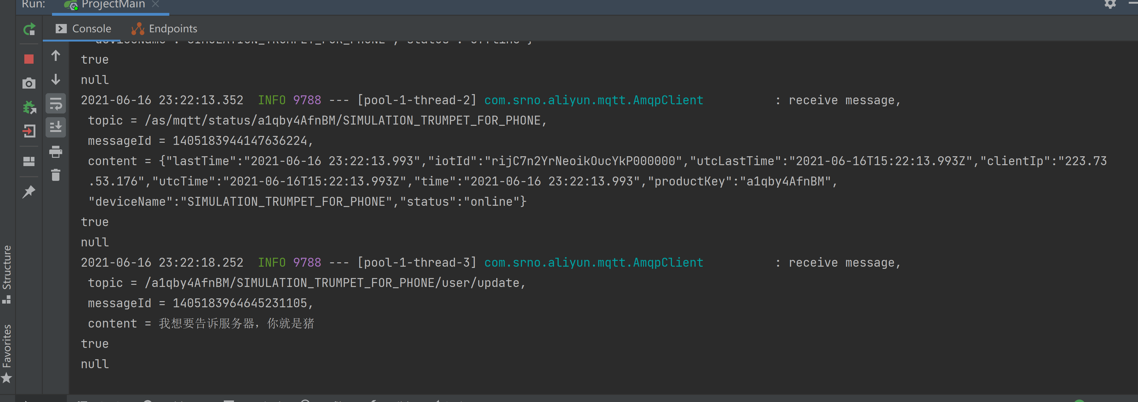 至此,我们完成了终端-MQTT服务器-业务服务器的数据流转。