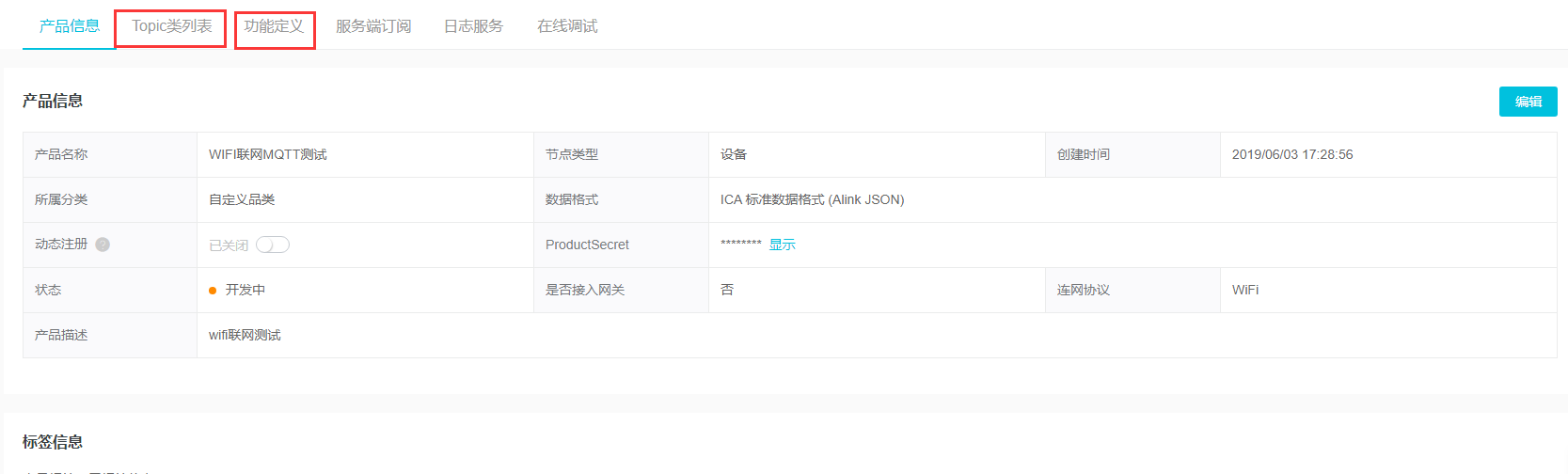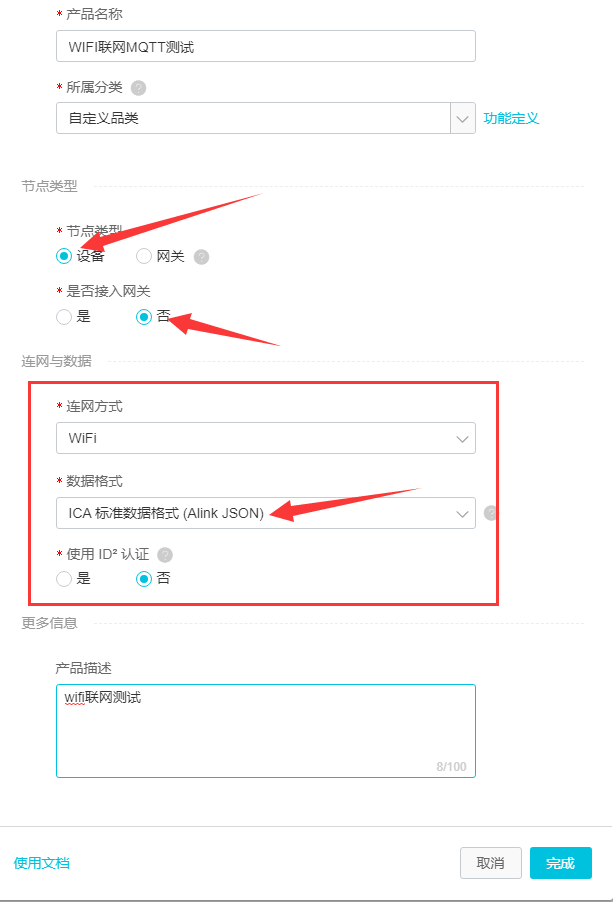 主要的注意结点类型和联网里面的选项,产品名称,分类等都没什么说的,完成创建后就可以继续创建设备了。