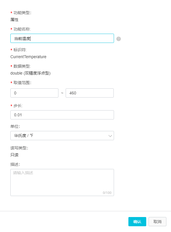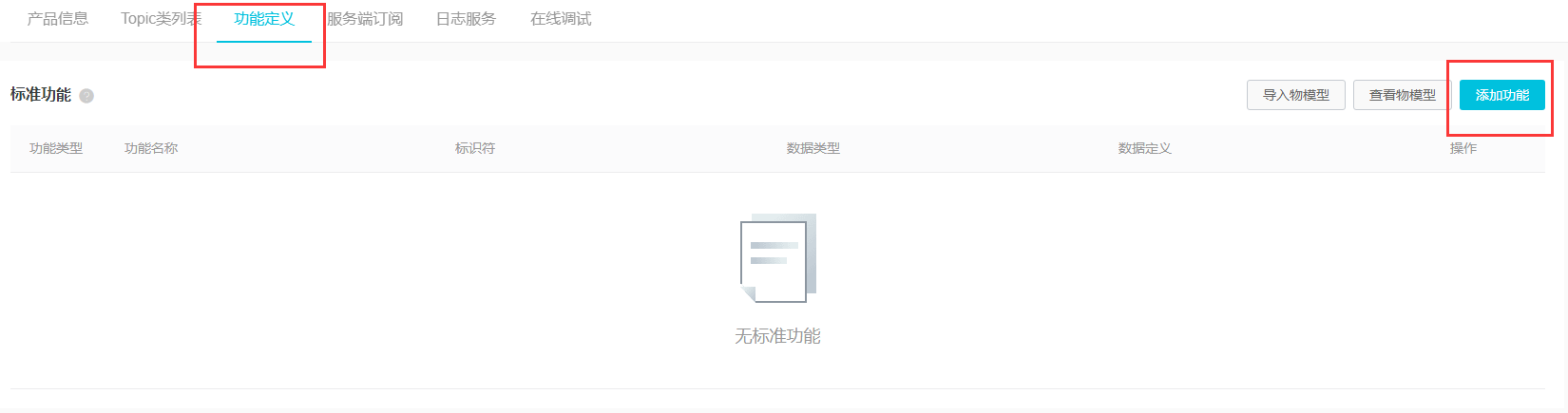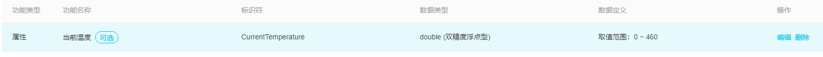 首先要定义这个产品的功能,产品嘛,肯定需要用来做什么,比如手机,打电话是个功能,发短信也是个功能,我们在这里简单的新建两个功能,一个是环境温度,一个是RGB灯,哈哈,每次测试都用这两个东西,太烂大街了。这里再次说明一下为什么要用这两个,第一是环境温度,温度是设备自身去采集的,所以这个温度可以通过设备上报给服务器,这也就是完成了设备端上报数据到服务器端的过程;另外一个是RGB灯,这里主要是通过服务器下发命令,来完成对下属设备的控制。这温度和灯两兄弟就刚好完成了设备端和服务器端之间的上报和下发的过程,没错也就是完整的双工通信的过程,另外这里RGB灯的颜色我也让它可以去上报。