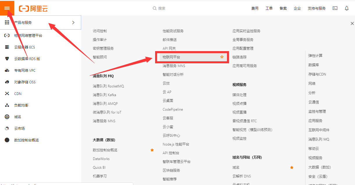 点击左侧的栏目找到“产品与服务”,在里面继续找到“应用与服务下面的”“物联网平台”