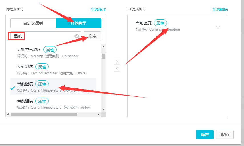 测试就标准功能就可以,怎么简单怎么好,进去之后选《其他类型》,然后搜索温度,这里随便选一个“当前温度”,OK