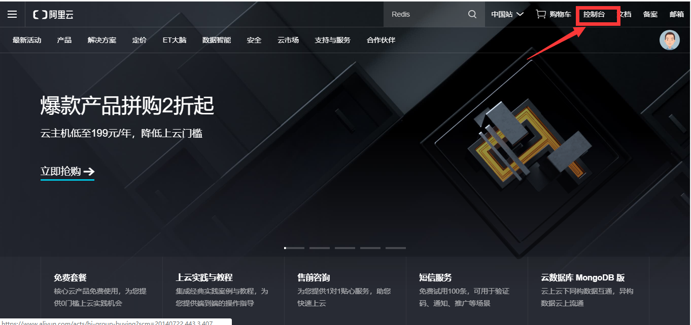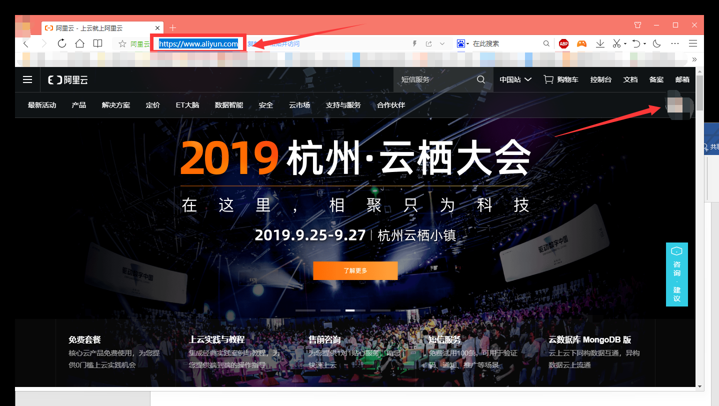 打开阿里云官网https://www.aliyun.com/,注册并登录