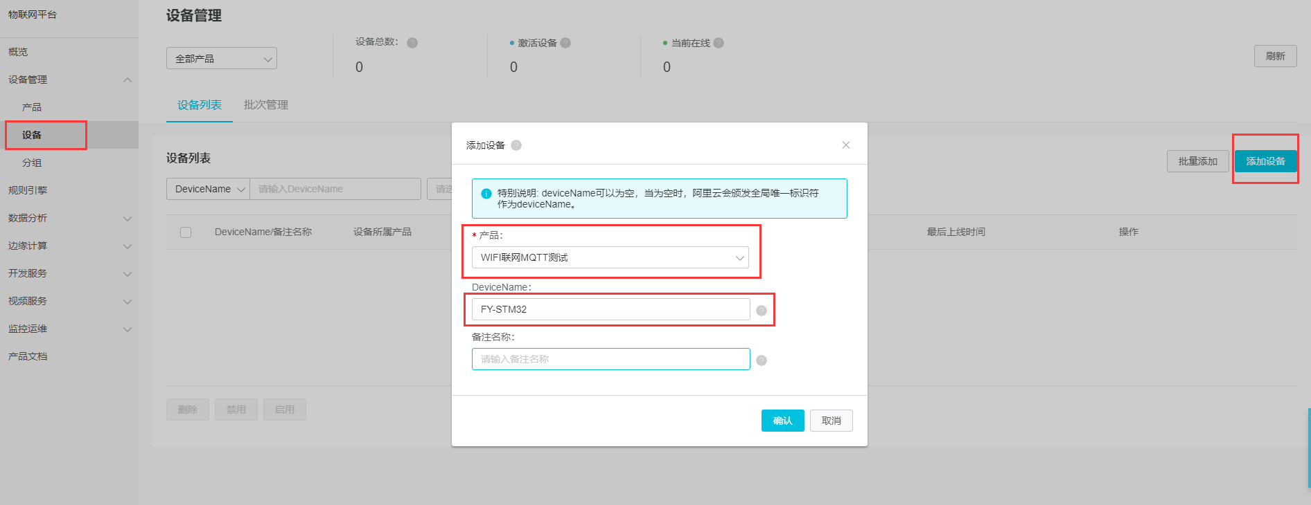 接下来在设备里面创建一个刚才我们定义好的这个产品的一个设备,再多说一句,刚才的产品只是我们提出的一个概念,现在的设备才是这个产品的实现。