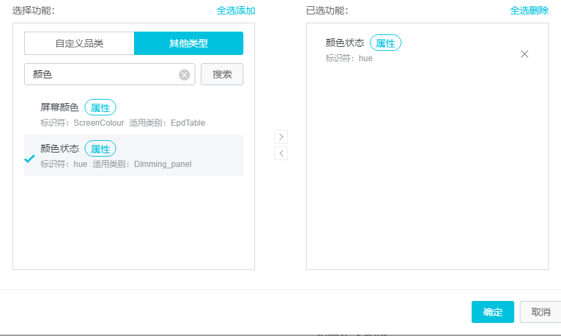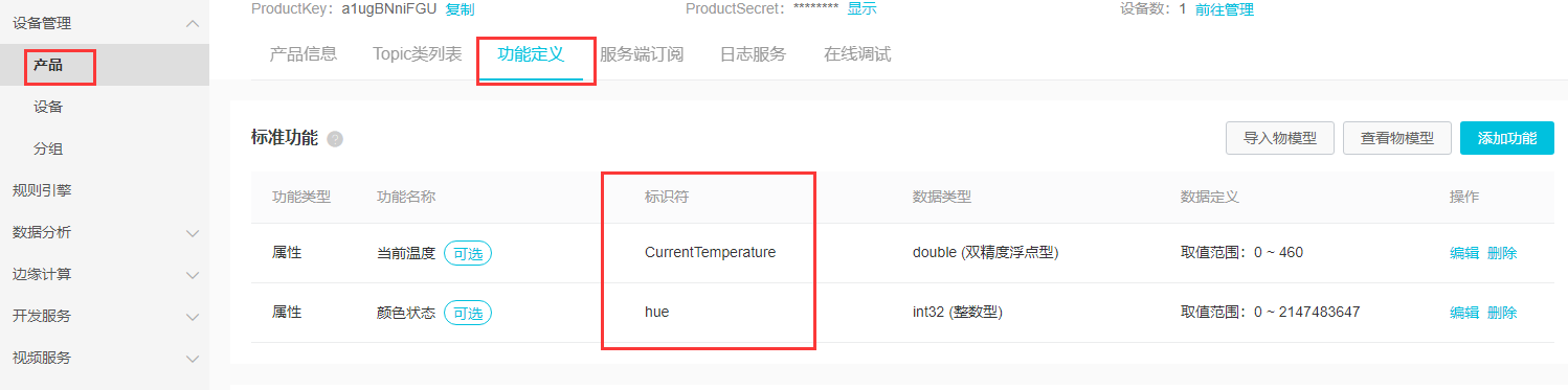 接下来说下需要注意的地方,首先是数据格式,这个,,,没什么好说的,标准的josn,我也不大懂。这里面我们只关心一个地方,就是param里面的内容,现在能看到有一行“hue”:“12345”,这里面的12345正是我们使用平台下发的数据,至于前面的hue,其实是颜色功能所对应的关键字,不是定义了两个功能吗,另外一个是温度,现在我们来看看,在产品的功能定义里面: