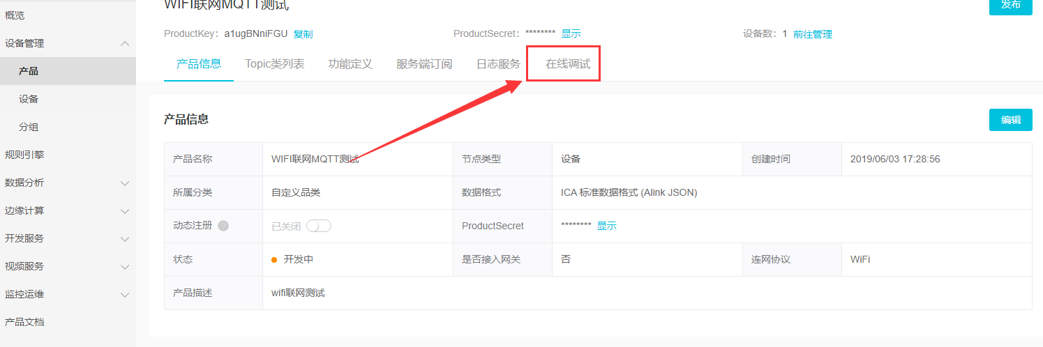 找到产品,查看,里面有一个在线调试,