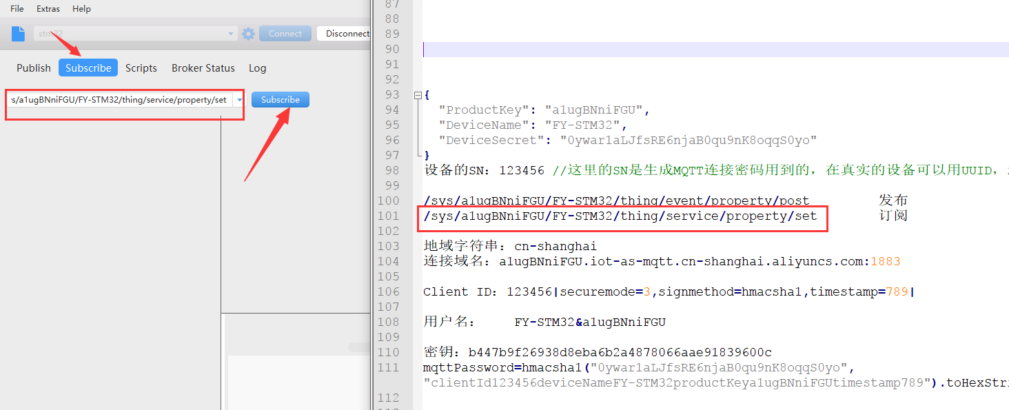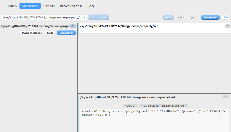 这样就已经连接成功了。接下来就是数据的下发和上传,首先我们试下平台给设备下发,在下发之前我们需要在让设备去订阅,这就要用到上面复制好的Topic列表的内容了,具体操作如下: