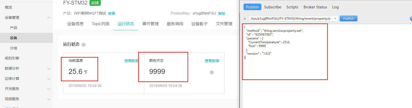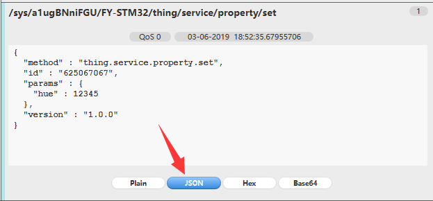 确定好要发送的主题,接下来就是数据了,数据里面我开始根据文档来做,估计是文档没有更新过来把,没成功,感觉被坑了,后来突发奇想用收到的数据格式发送过去,竟然成功了,这里举个例子,假设下载温度是25.6°,然后设备的颜色色值是9999,然后发送内容如下: