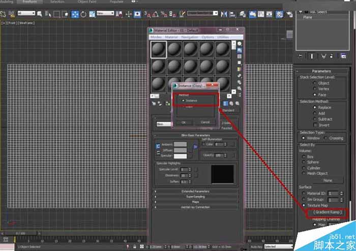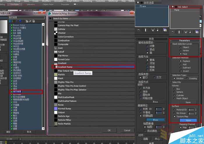 第二步:添加“体积选择”修改器,将子层级选择层级改为“面”选择。曲面特征改为“纹理贴图”模式来选择,这里要选择【坡度渐变贴图-Gradient Ramp】,点击OK确定。