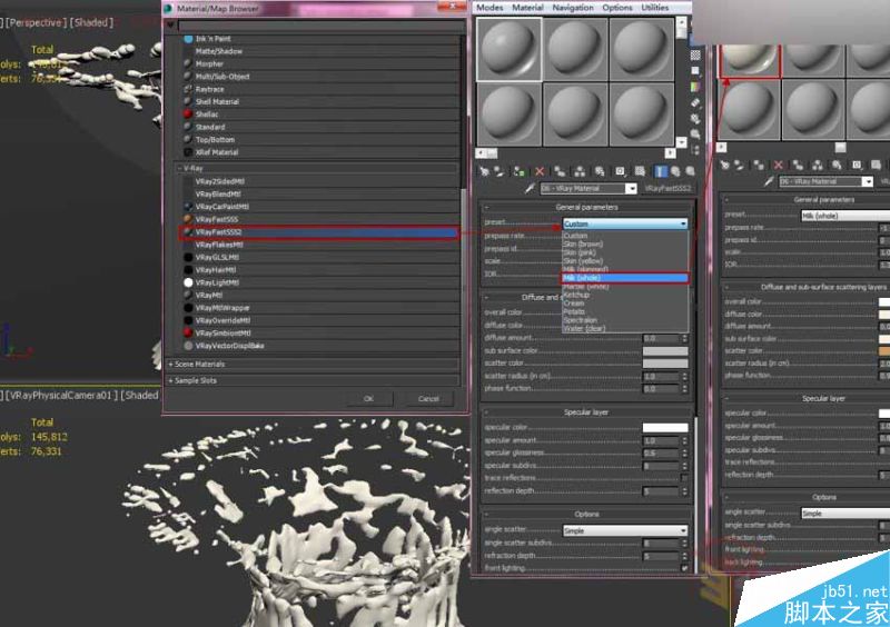 第十四步:调节牛奶的材质,Vray快速3S材质2号(VRayFastSSS2)主要用于渲染像皮肤、大理石这样的半透明材料,牛奶的选项有脱脂牛奶(Milk skimmed) 和全脂牛奶(Milk whole),我们就选择全脂牛奶吧,参数预设就行。