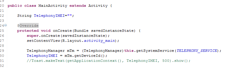 TelephonyManager mTm = (TelephonyManager)this.getSystemService(TELEPHONY_SERVICE); TelephonyIMEI = mTm.getDeviceId();