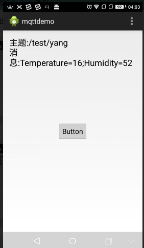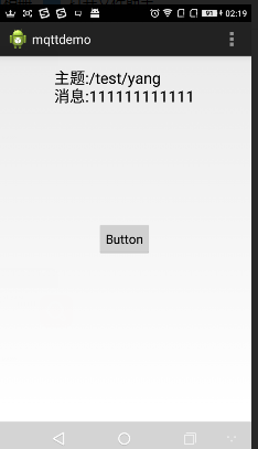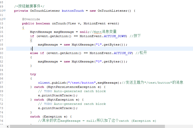 public class MainActivity extends Activity { String TelephonyIMEI=""; private MqttClient client;//client private MqttConnectOptions options;//配置 MqttConnectThread mqttConnectThread = new MqttConnectThread();//连接服务器任务 Button button;//发送消息按钮 @Override protected void onCreate(Bundle savedInstanceState) { super.onCreate(savedInstanceState); setContentView(R.layout.activity_main); button = (Button) findViewById(R.id.button1);//获取发送消息按钮 button.setOnTouchListener(buttonTouch);//设置按钮的触摸事件 TelephonyManager mTm = (TelephonyManager)this.getSystemService(TELEPHONY_SERVICE); TelephonyIMEI = mTm.getDeviceId(); //Toast.makeText(getApplicationContext(), TelephonyIMEI, 500).show(); MyMqttInit();//初始化配置MQTT客户端 mqttConnectThread.start();//执行连接服务器任务 } /*按钮触摸事件*/ private OnTouchListener buttonTouch = new OnTouchListener() { @Override public boolean onTouch(View v, MotionEvent event) { MqttMessage msgMessage = null;//Mqtt消息变量 if (event.getAction() == MotionEvent.ACTION_DOWN) //按下 { msgMessage = new MqttMessage("1".getBytes()); } else if (event.getAction() == MotionEvent.ACTION_UP) //松开 { msgMessage = new MqttMessage("0".getBytes()); } try { client.publish("/test/button",msgMessage);//发送主题为"/test/button"的消息 } catch (MqttPersistenceException e) { // TODO Auto-generated catch block e.printStackTrace(); } catch (MqttException e) { // TODO Auto-generated catch block e.printStackTrace(); } catch (Exception e) { //其余的状态msgMessage = null;所以加了这个catch (Exception e) } return false; } };
