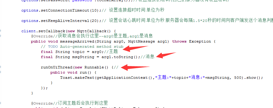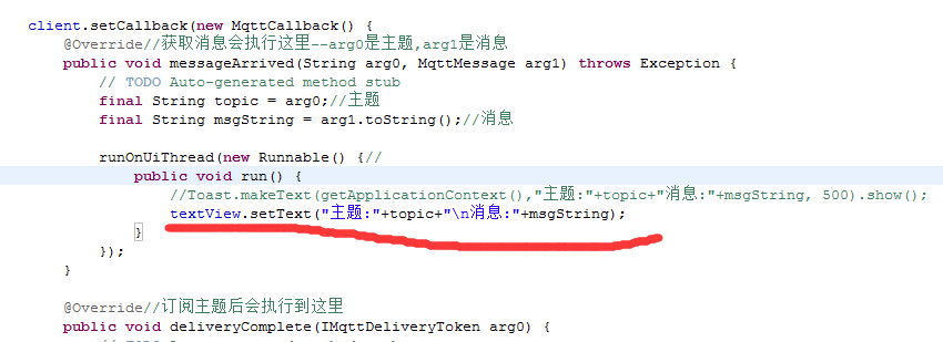 runOnUiThread(new Runnable() {//因为操作的是主界面的控件所以用刷新UI的线程,最好用handle哈,我这里怎么简单怎么写 public void run() { //Toast.makeText(getApplicationContext(),"主题:"+topic+"消息:"+msgString, 500).show(); textView.setText("主题:"+topic+"n消息:"+msgString); } });