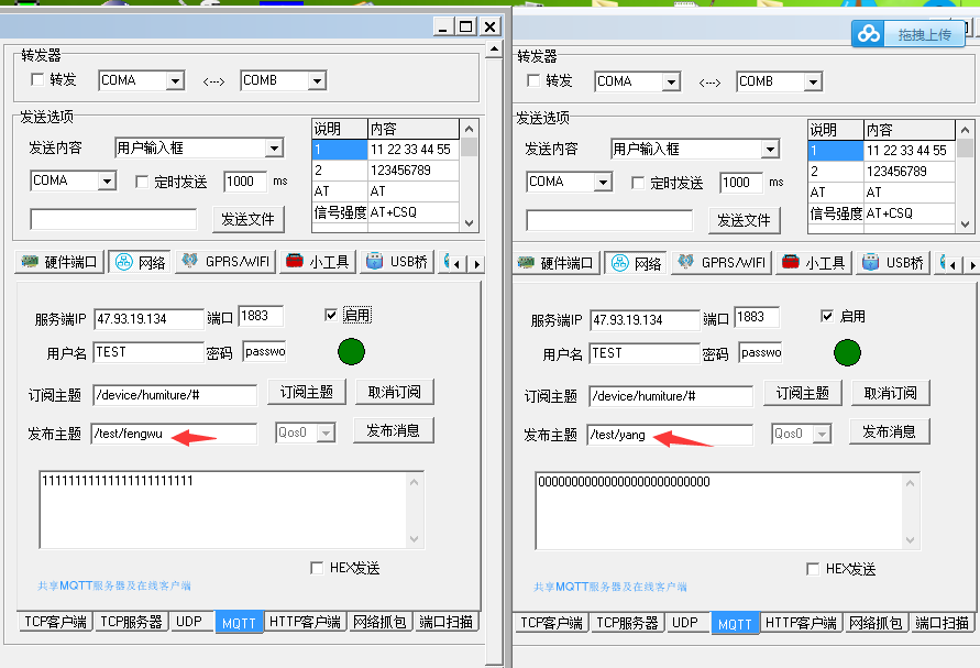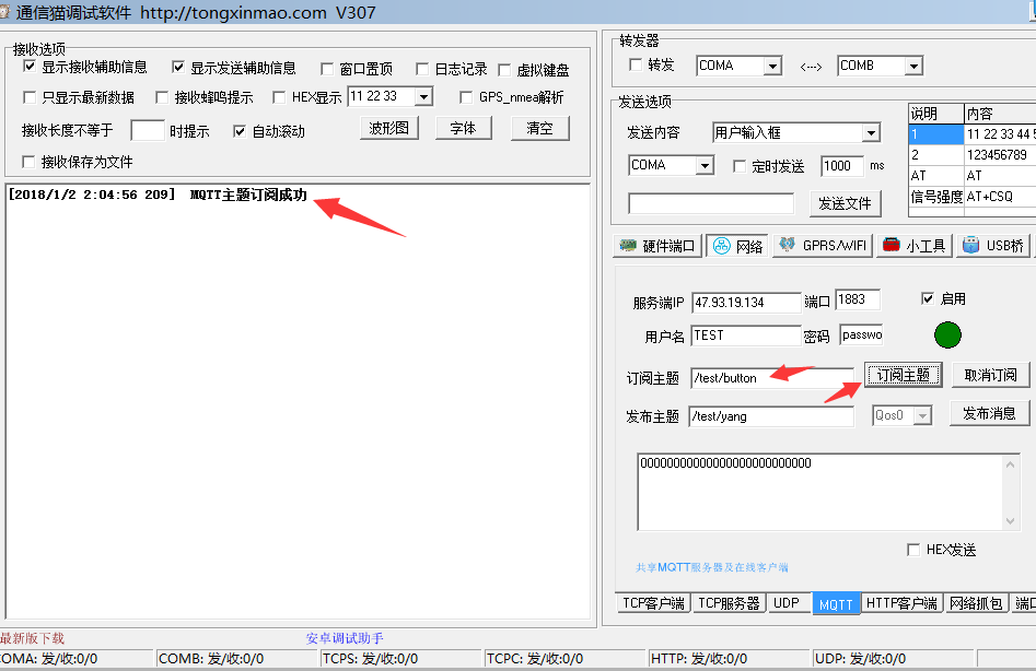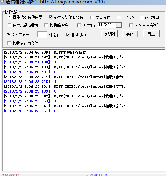 调试助手订阅一下主题 "/test/button"