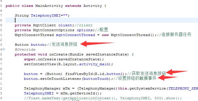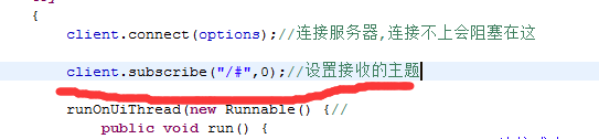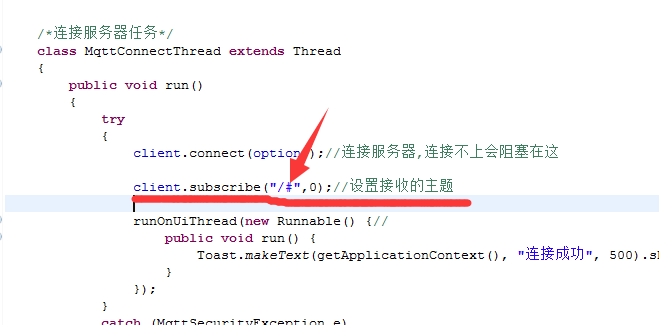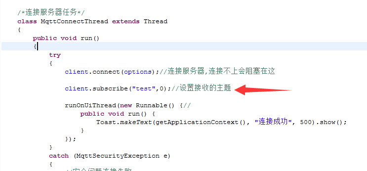 public class MainActivity extends Activity { String TelephonyIMEI=""; private MqttClient client;//client private MqttConnectOptions options;//配置 MqttConnectThread mqttConnectThread = new MqttConnectThread();//连接服务器任务 @Override protected void onCreate(Bundle savedInstanceState) { super.onCreate(savedInstanceState); setContentView(R.layout.activity_main); TelephonyManager mTm = (TelephonyManager)this.getSystemService(TELEPHONY_SERVICE); TelephonyIMEI = mTm.getDeviceId(); //Toast.makeText(getApplicationContext(), TelephonyIMEI, 500).show(); MyMqttInit();//初始化配置MQTT客户端 mqttConnectThread.start();//执行连接服务器任务 } /* 初始化配置Mqtt */ private void MyMqttInit() { ......... } /*连接服务器任务*/ class MqttConnectThread extends Thread { public void run() { try { client.connect(options);//连接服务器,连接不上会阻塞在这 runOnUiThread(new Runnable() {// public void run() { Toast.makeText(getApplicationContext(), "连接成功", 500).show(); } }); } catch (MqttSecurityException e) { //安全问题连接失败 } catch (MqttException e) { //连接失败原因 } } }