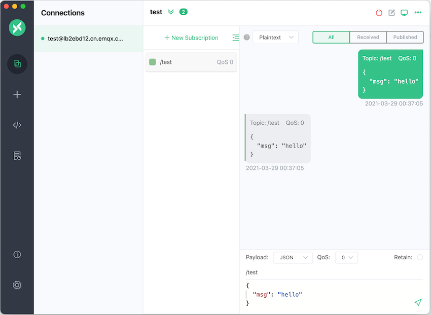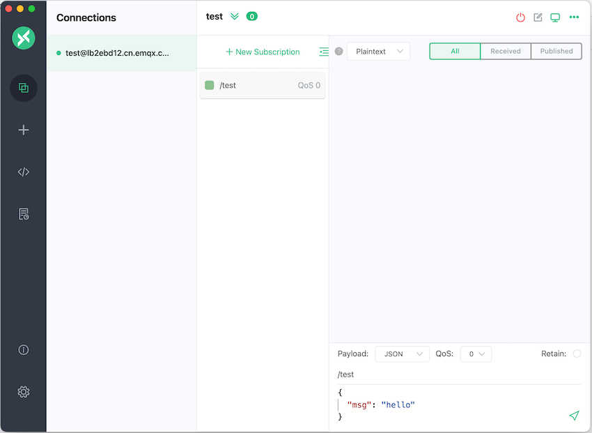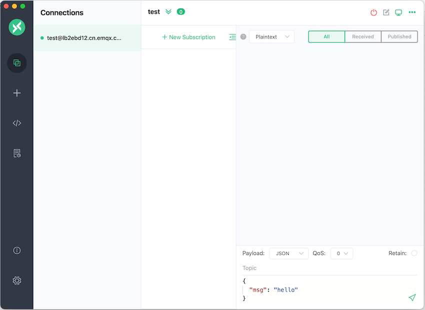 此时我们可以看到我们已经成功订阅了 "/test" 主题。那么接下来,我们试着往该主题发布一条消息看是否能收到。