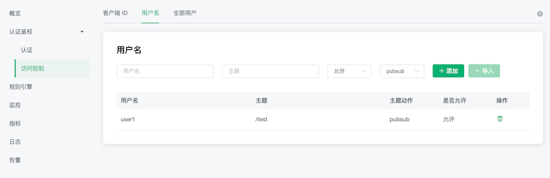 在访问控制的列表中我们可以看到刚刚添加的这条记录。这条记录的含义为:允许 user1 用户向 ”/test“ 主题发送消息,也允许该用户订阅 ”/test“ 主题。当然,你也可以根据需要,配置不允许发布和订阅的主题,亦或是只允许某个主题发布,或者是订阅。有关更多的使用规则,您可以参考我们专门介绍认证鉴权的教程内容。