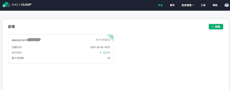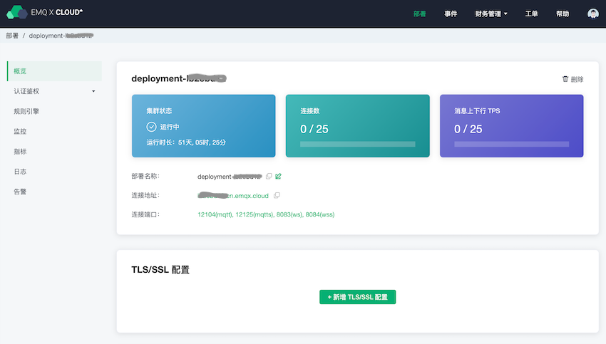 点击”立即部署“,等待几分钟后,我们就可以拥有一个专享的 MQTT 集群了,并且是全托管的。