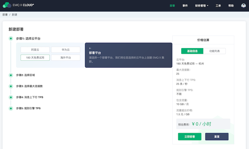 EMQ X Cloud 目前国内支持阿里云和华为云两个公有云平台,海外支持 AWS 平台。然而,该产品的免费试用版本仅支持阿里云和AWS两个平台,并且连接的并发量限制在了25线,但这并不妨碍我们创建免费的实例,作为研究和学习之用,25线在正常情况下已经足够用了。