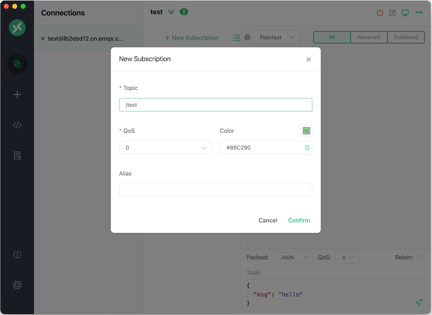 接着,我们先创建一个订阅。点击 "+ New Subscription" 按钮,订阅的topic名我们改为之前配置的访问控制中的 "/test" 。点击确认。