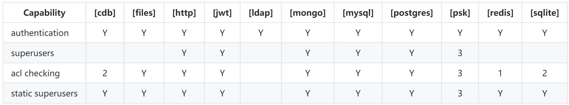 该插件可以执行身份验证(检查用户名/密码)和授权(通过 ACL 授予订阅和/或发布特定主题的许可),通过与数据库绑定,将身份验证和 ACL 管理录入数据库,从而很方便的实现用户身份验证管理。该插件对数据库 mysql 及 mongodb 支持很友好。具体怎么使用可以参考 README。这里仅给出 mysql 配置示例。