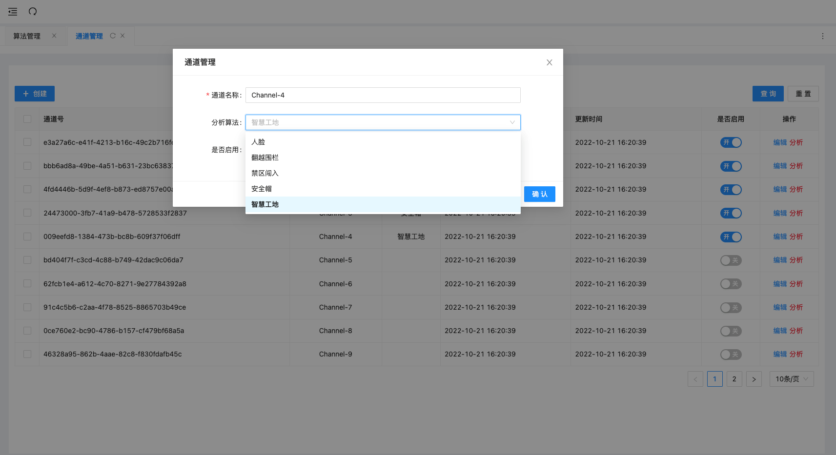 智能分析网关平台会生成默认的通道,用户可以在通道管理中配置算法模型。比如,我们为通道4配置了智慧工地模型后,列表操作栏就可以使用该算法模型来测试其功能效果。