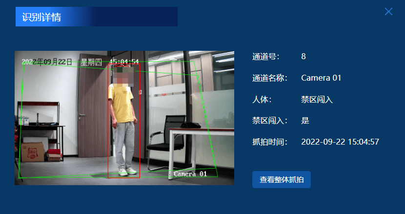 对既定区域实时检测,如:有人员闯入禁区、危险区域、重要区域等,及时抓拍入侵人员并报警,还可联动现场语音进行提示,方便及时制止。