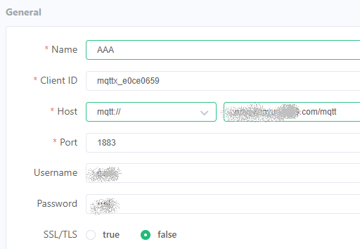 打开软件之后新建连接。名字随便起,地址和用户名密码就按照对方给的MQTT服务器信息填,端口号默认1883。
