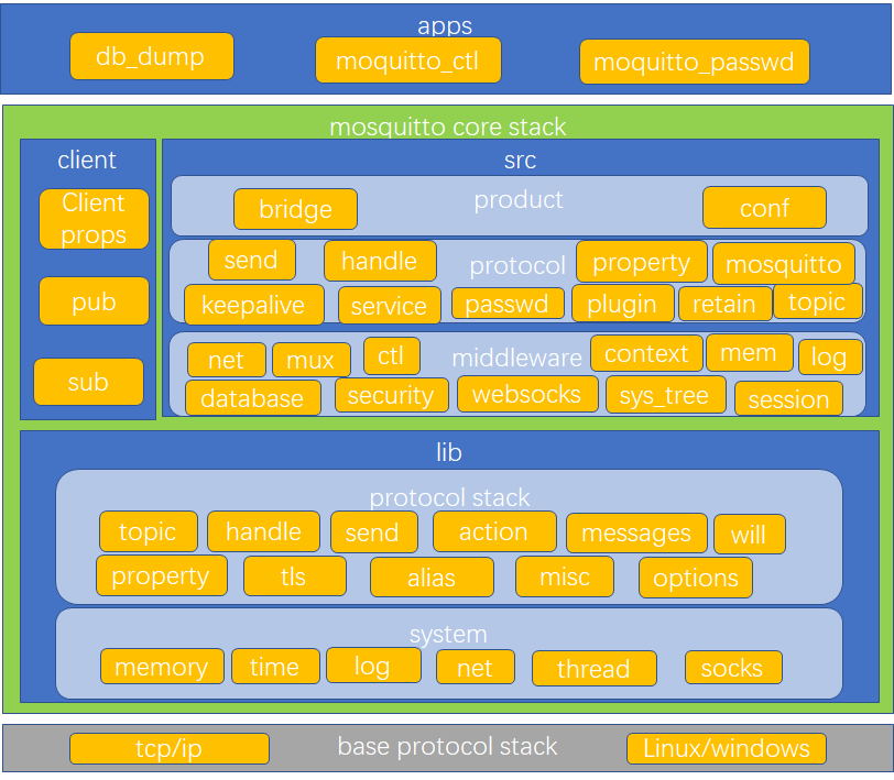 从图中可以看出主要包括apps和核心协议栈两大块,其中最重要的是核心协议栈。apps处于顶层,本身依赖于核心协议栈,主要是面对应用界面,对外提供可裁剪的安全的mqtt协议。接下来的核心协议栈,主要是实现了整个的mqtt协议栈,并对外提供产品化服务,其内部又包含了三大块:基础的底层lib,产品化相关的src,客户端有关的client。这三者之间lib是src和client的基础。lib的主要功能是实现mqtt协议栈,跟标准协议实现相对应的,还包括一些基础的系统和网络管理功能,lib可以为broker和client提供业务支撑。src主要是在lib的基础上,对协议栈做了产品化和业务处理,同时也对外提供除协议栈以外的功能,比如数据处理,通信连接等,更加注重端到端的产品化应用,比如bridge产品,更多地承担broker的角色。client主要是对配置做解析,并提供订阅和发布两项基本配置,主要承担客户端角色。