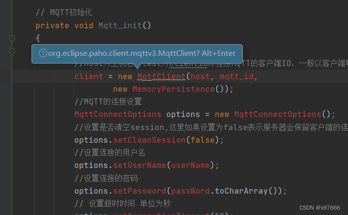 此时我们来到java代码界面敲MQTT就可以看到很多方法