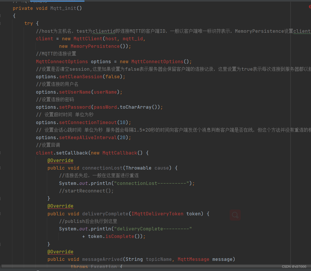 //host为主机名,test为clientid即连接MQTT的客户端ID,一般以客户端唯一标识符表示,MemoryPersistence设置clientid的保存形式,默认为以内存保存