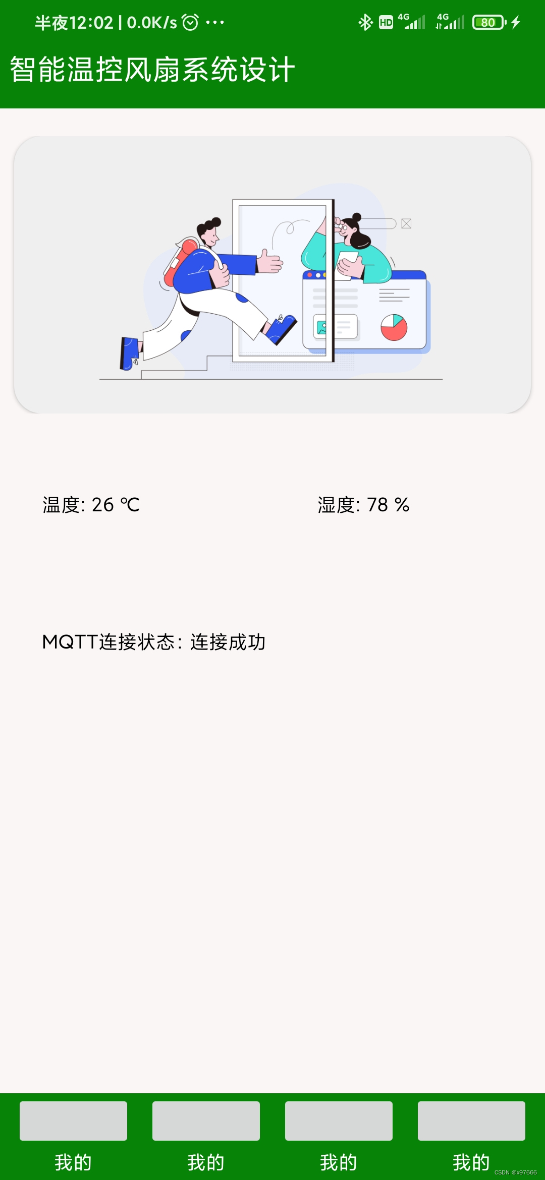 这里设计的是一个监测控制智能风扇的APP,可以实时监测当前温度、湿度及下位机的传感器、控制器件的一些状态。