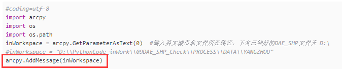 inWorkspace = arcpy.GetParameterAsText(0) #输入英文城市名文件所在路径,下含已转好的DAE_SHP文件夹 D: