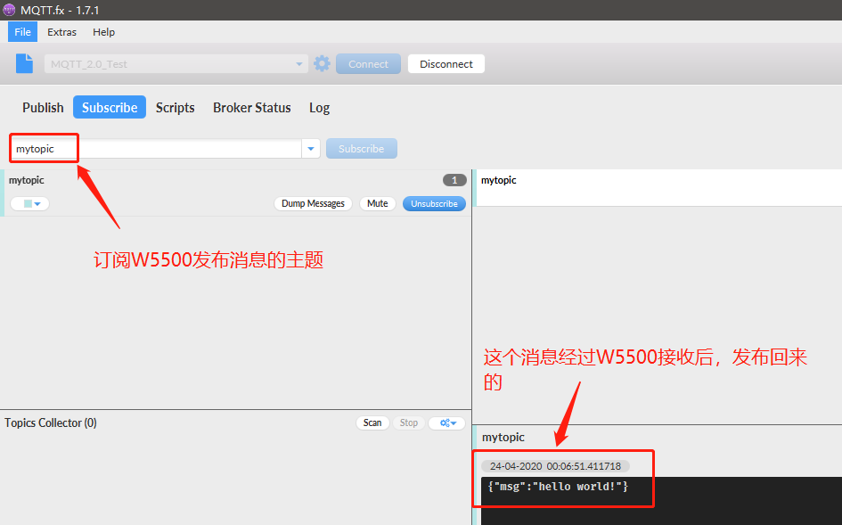 测试的主函数,是做了MQTT的回环测试,MQTT Client端连接到broker后,发起订阅主题,并一次性订阅多个主题,分别是字符串subtopic、subtopic2、subtopic3、subtopic4。当其他客户端连接到broker后,向这四个主题发布消息,STM32 W5500 MQTT Client端接收后,会向 mytopic发布一条消息。