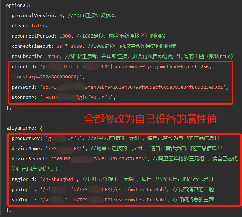 在参考文章中下载源码,然后在微信小程序开发者工具中打开,并且修改下图中这些信息,改成你自己的设备的属性值: