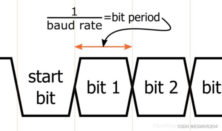 - 波特率:用于描述UART通信时的通信速度,其单位为bps(bit per second)即每秒钟传送的码元。(简而言之:串口传输的波特率即为每秒钟传输二进制的位数)常见的波特率9600bps,115200bps等等,其他标准的波特率是1200,2400,4800,19200,38400,57600。举个例子,如果串口波特率设置为9600bps,那么传输一个比特需要的时间是1/9600≈104.2us。
